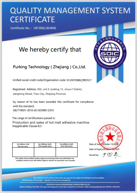Purking Technology (Zhejiang) Co., Ltd.ιδρύθηκε το 2014, Είναι μια επαγγελματική εταιρεία συγκολλητικών μηχανών θερμού τήγματος που ενσωματώνει έρευνα, ανάπτυξη, μάρκετινγκ, εκπαίδευση προσωπικού και εξυπηρέτηση μετά την πώληση, Η εταιρεία διαθέτει περισσότερα από 1000 τετραγωνικά μέτρα εργοστασιακών κτιρίων. Η έδρα πωλήσεων της εταιρείας βρίσκεται στην πόλη Yiwu, επαρχία Zhejiang. Το κέντρο παραγωγής και συναρμολόγησης βρίσκεται στην πόλη Dongguan, στην επαρχία Γκουανγκντόνγκ. |
